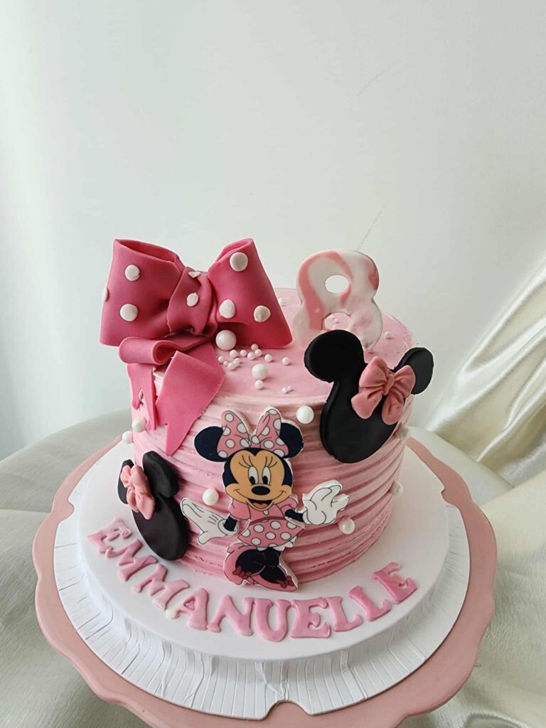 Biscuit moelleux garni d’une crème gourmande, décoré d’un glaçage rose délicat, d’un gros nœud à pois, de perles sucrées et de silhouettes de Minnie.